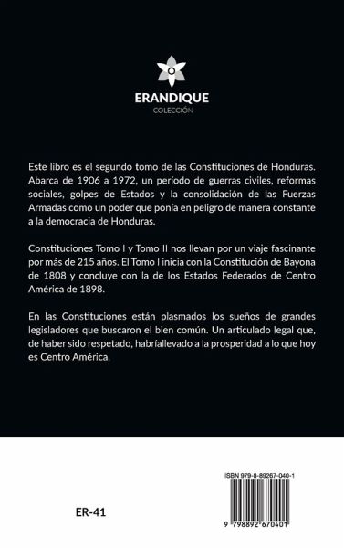 Este libro es el segundo tomo de las Constituciones de Honduras. Abarca de 1906 a 1972, un período de guerras civiles, reformas sociales, golpes de Estados y la consolidación de las Fuerzas Armadas como un poder que ponía en peligro de manera constante a la democracia de Honduras. Constituciones Tomo I y Tomo II nos llevan por un viaje fascinante por más de 215 años. El Tomo I inicia con la Constitución de Bayona de 1808 y concluye con la de los Estados Federados de Centro América de 1898. En las Constituciones están plasmados los sueños de grandes legisladores que buscaron el bien común. Un articulado legal que, de haber sido respetado, habría llevado a la prosperidad a lo que hoy es Centro América.