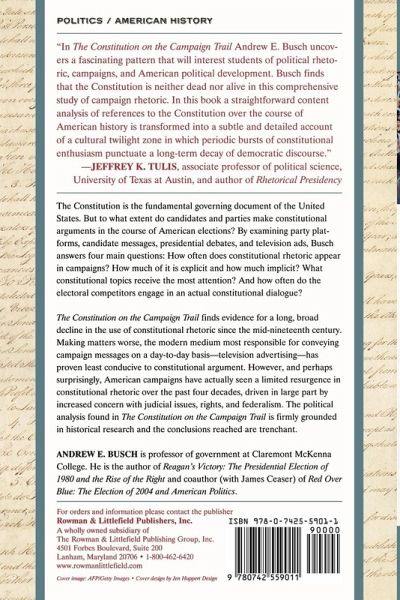 The Constitution is the fundamental governing document of the United States. But to what extent do candidates and parties make constitutional arguments in the course of American elections? By examining party platforms, candidate messages, presidential debates, and television ads, The Constitution on the Campaign Trail answers that question, and the results are fascinating. Busch finds evidence for both a long, broad decline in the use of constitutional rhetoric since the mid-19th century and a limited resurgence in that rhetoric over the last four decades. The political analysis found here is firmly grounded in historical research and the conclusions reached are trenchant.