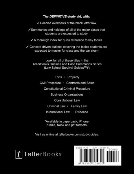 The definitive law school study aid, with: ¿Concise overviews of the black letter law ¿Summaries and holdings of all of the major cases that students are expected to study ¿A thorough index for quick reference to key topics ¿ Concept-driven outlines covering the topics students are expected to master for class and the bar exam Look for all of these titles in the TellerBooks Outlines and Case Summaries Series (Law School Survival Guides¿)*: Torts ¿ Property ¿ Civil Procedure ¿ Contracts and Sales ¿ Constitutional Criminal Procedure ¿ Business Organizations ¿ Constitutional Law ¿ Criminal Law ¿ Family Law ¿ International Law ¿ Evidence *Available in paperback, iPhone, Kindle, Nook and pdf formats. Visit us at tellerbooks.com/studyguides.
