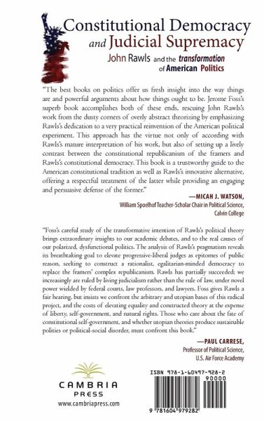 "The best books on politics offer us fresh insight into the way things are, and powerful arguments about how things ought to be. Jerome Foss's superb book accomplishes both of these ends, rescuing John Rawls's work from the dusty corners of overly abstract theorizing by emphasizing Rawls's dedication to a very practical reinvention of the American political experiment. This approach has the virtue not only of according with Rawls's mature interpretation of his work, but also of setting up a lively contrast between the constitutional republicanism of the framers and Rawls's constitutional democracy. This book is a trustworthy guide to the American constitutional tradition as well as Rawls's innovative alternative, offering a respectful treatment of the latter while providing an engaging and persuasive defense of the former." -Micah J. Watson, William Spoelhof Teacher-Scholar Chair in Political Science, Calvin College "Foss's careful study of the transformative intention of Rawls's political theory brings extraordinary insights to our academic debates, and to the real causes of our polarized, dysfunctional politics. The analysis of Rawls's pragmatism reveals its breathtaking goal to elevate progressive-liberal judges as epitomes of public reason, seeking to construct a rationalist, egalitarian-minded democracy to replace the framers' complex republicanism. Rawls has partially succeeded; we increasingly are ruled by living judicialism rather than the rule of law, under novel power wielded by federal courts, law professors, and lawyers. Foss gives Rawls a fair hearing, but insists we confront the arbitrary and utopian bases of this radical project, and the costs of elevating equality and constructed theory at the expense of liberty, self-government, and natural rights. Those who care about the fate of constitutional self-government, and whether utopian theories produce sustainable polities or political-social disorder, must confront this book." -Paul Carrese, Professor of Political Science, U.S. Air Force Academy