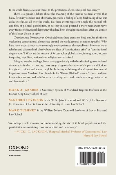 * 1.: Mark A.Graber, Sanford Levinson, and Mark Tushnet: Constitutional Democracy in Crisis? Introduction * Part I: Background * 2.: Jack M. Balkin: Constitutional Crisis and Constitutional Rot * 3.: Tom Ginsburg and Aziz Z. Huq: Defining and Tracking the Trajectory of Liberal Constitutional Democracy * 4.: Zachary Elkins: Is the Sky Falling? Constitutional Crises in Historical Perspective * 5.: Ellen Kennedy: Constitutional Failure Revisited * Part II: Countries and Regions * 6.: Jennifer Hochschild: What's New? What's Next? Threats to the American Constitutional Order * 7.: Eric A. Posner: The Trump Presidency: A Constitutional Crisis in the United States? * 8.: Richard Albert and Michael Pal: The Democratic Resilience of the Canadian Constitution * 9.: Ana Micaela Alterio and Roberto Niembro: Constitutional Culture and Democracy in Mexico: A Critical View of the 100-Year-Old Mexican Constitution * 10.: David E. Landau: Constitution-Making and Authoritarianism in Venezuela: The First Time as Tragedy, the Second as Farce * 11.: Roberto Gargarella: Latin America: Constitutions in Trouble * 12.: Erin F. Delaney: Brexit Optimism and British Constitutional Renewal * 13.: Nicolas Roussellier: France and the Fifth Republic: Constitutional Crisis or Political Malaise? * 14.: Victor Ferreres Comella: Constitutional Crisis in Spain: The Catalan Secessionist Challenge * 15.: Gábor Halmai: A Coup Against Constitutional Democracy: The Case of Hungary * 16.: Wojciech Sadurski: Constitutional Crisis in Poland * 17.: Michaela Hailbronner: Beyond Legitimacy: Europe's Crisis of Constitutional Democracy * 18.: Heinz Klug: State Capture or Institutional Resilience: Is there a Crisis of Constitutional Democracy in South Africa * 19.: James Thuo Gathii: Three Types of Constitutional Crisis in Sub-Saharan Africa * 20.: Ozan O. Varol: Stealth Authoritarianism in Turkey * 21.: Yaniv Roznai: Israel: A Crisis of Liberal Democracy? * 22.: Manoj Mate: Constitutional Erosion and the Challenge to Secular Democracy in India * 23.: Rosalind Dixon and Anika Gauja: Australia's Non-Populist Democracy? The Role of Structure and Policy * 24.: David S. Law and Chien-Chih Lin: Constitutional Inertia in Asia * Part III: Factors * 25.: Samuel Issacharoff: Populism versus Democratic Governance * 26.: Desmond King and Rogers M. Smith: Populism, Racism, and the Rule of Law in Constitutional Democracies Today * 27.: Alexander Aleinikoff: Inherent Instability: Immigration and Constitutional Democracies * 28.: Kim Lane Scheppele: The Party's Over * 29,: Ran Hirschl and Ayelet Shachar: 'Religious Talk' in Narratives of Membership * 30.: Ganesh Sitaraman: Economic Inequality and Constitutional Democracy * 31.: David Schneiderman: Disabling Constitutional Capacity: Global Economic Law and Democratic Decline * 32.: Sujit Choudhry: Will Democracy Die in Darkness? Calling Autocracy by its Name * 33.: Oren Gross: The Normal Exception * 34.: Robert V. Percival: The Climate Crisis and Constitutional Democracies * Part IV: Observations * 35.: J.H.H. Weiler: The Crumbling of European Democracy * 36.: Mark Tushnet: Comparing Right-Wing and Left-Wing Populism * 37.: Sanford Levinson: The Continuing Specter of Popular Sovereignty and National Self-Determination in an Age of Political Uncertainty * 38.: Mark A. Graber: What's in Crisis? The Postwar Constitutional Paradigm, Tranformative Constitutionalism, and the Fate of Constitutional Democracy * List of Contributors * Acknowledgments * Index