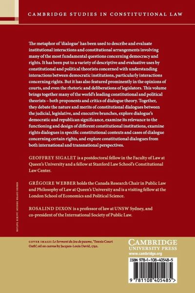 1. Introduction: the 'what' and 'why' of constitutional dialogue Geoffrey Sigalet, Grégoire Webber and Rosalind Dixon; Part I. Dialogue and Democracy: 2. Dialogue and its myths Alison Young; 3. Departmentalism and dialogue Jacob T. Levy; 4. On dialogue and domination Geoffrey Sigalet; Part II. Dialogue and Institutions: 5. Past, present, and justice in the exercise of judicial responsibility Grégoire Webber; 6. Dialogue and deference Rosalind Dixon; 7. Dialogue, finality, and legality Jeff King; Part III. Dialogue and Rights: 8. Canada's notwithstanding clause, dialogue, and constitutional identities Dwight Newman; 9. Intra-parliamentary dialogues in New Zealand and the UK Janet L. Hiebert and James B. Kelly; 10. Dialogue in Canada and the dangers of simplified comparative law and populism Kent Roach; 11. Bills of rights with strings attached: protecting the past from judicial review Rivka Weill; Part IV. Case Studies of Dialogue: 12. Prisoners' voting and judges' powers John Finnis; 13. 'All's well that ends well?' Same-sex marriage and constitutional dialogue Stephen Macedo; 14. A feature, not a bug: a co-ordinate moment in Canadian constitutionalism Dennis Baker; Part V. International and Transnational Dialogues: 15. Dialogue and its discontents Frederick Schauer; 16. Constitutional conversations in Britain (and Europe) Richard Ekins.