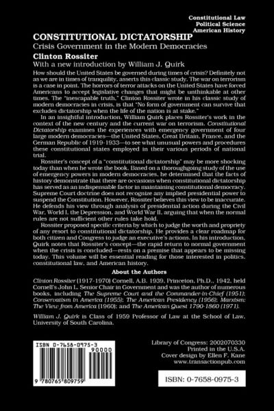 How should the United States be governed during times of crisis? Definitely not as we are in times of tranquility, asserts this classic study. The war on terrorism is a case in point. The horrors of terror attacks on the United States have forced Americans to accept legislative changes that might be unthinkable at other times. The "inescapable truth," Clinton Rossiter wrote in his classic study of modern democracies in crisis, is that "No form of government can survive that excludes dictatorship when the life of the nation is at stake."In an insightful introduction, William Quirk places Rossiter's work in the context of the new century and the current war on terrorism. Constitutional Dictatorship examines the experiences with emergency government of four large modern democracies-the United States, Great Britain, France, and the German Republic of 1919-1933-to see what unusual powers and procedures these constitutional states employed in their various periods of national trial.Rossiter's concept of a "constitutional dictatorship" may be more shocking today than when he wrote the book. Based on a thoroughgoing study of the use of emergency powers in modern democracies, he determined that the facts of history demonstrate that there are occasions when constitutional dictatorship has served as an indispensable factor in maintaining constitutional democracy. Supreme Court doctrine does not recognize any implied presidential power to suspend the Constitution. However, Rossiter believes this view to be inaccurate. He defends his view through analysis of presidential action during the Civil War, World I, the Depression, and World War II, arguing that when the normal rules are not sufficient other rules take hold.Rossiter proposed specific criteria by which to judge the worth and propriety of any resort to constitutional dictatorship. He provides a clear roadmap for both citizen and Congress to judge an executive's actions. In his introduction, Quirk notes that Rossiter's concept-the rapid return to normal government when the crisis is concluded-rests on a premise that appears to be missing today. This volume will be essential reading for those interested in politics, constitutional law, and American history.