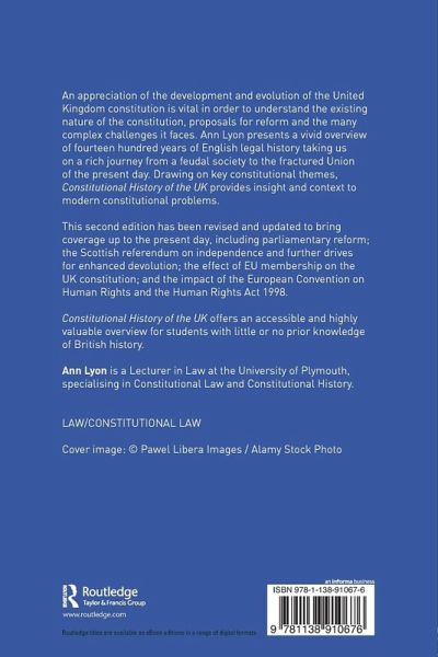 An appreciation of the development and evolution of the UK constitution is vital in order to understand the existing nature of the constitution, proposals for reform and the many complex challenges it faces. Ann Lyon presents a vivid overview of fourteen hundred years of English legal history taking us on a rich journey from a feudal society to the fractured Union of the present day. Drawing on key constitutional themes, this book provides insight and context to modern constitutional problems.