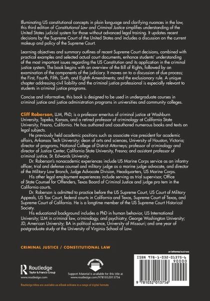 Illuminating US constitutional concepts in plain language and clarifying nuances in the law, this third edition of Constitutional Law and Criminal Justice simplifies understanding of the United States judicial system for those without advanced legal training. It updates recent decisions by the Supreme Court of the United States and includes a discussion on the current makeup and policy of the Supreme Court. Learning objectives and summary outlines of recent Supreme Court decisions, combined with practical examples and selected actual court documents, enhance students' understanding of the most important issues regarding the US Constitution and its application in the criminal justice system. The book begins with an overview of the Bill of Rights, followed by an examination of the components of the judiciary. It moves on to a discussion of due process; the First, Fourth, Fifth, Sixth, and Eighth Amendments; and the exclusionary rule. A unique chapter addressing civil liability and the criminal justice professional is especially relevant to students in criminal justice programs. Concise and informative, this book is designed to be used in undergraduate courses in criminal justice and justice administration programs in universities and community colleges.