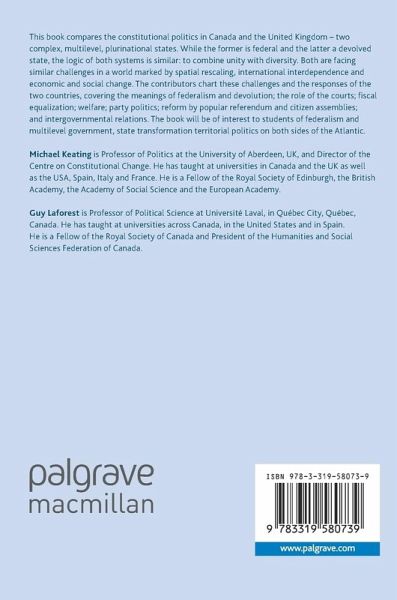 This book compares the constitutional politics in Canada and the United Kingdom - two complex, multilevel, plurinational states. While the former is federal and the latter a devolved state, the logic of both systems is similar: to combine unity with diversity. Both are facing similar challenges in a world marked by spatial rescaling, international interdependence and economic and social change. The contributors chart these challenges and the responses of the two countries, covering the meanings of federalism and devolution; the role of the courts; fiscal equalization; welfare; party politics; reform by popular referendum and citizen assemblies; and intergovernmental relations. The book will be of interest to students of federalism and multilevel government, state transformation territorial politics on both sides of the Atlantic.