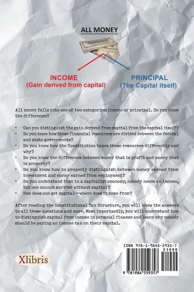All money falls into one of two categories: income or principal. Do you know the difference? Can you distinguish the gain derived from capital from the capital itself? Do you know how these financial resources are divided between the federal and state governments? Do you know how the Constitution taxes these resources differently and why? Do you know the difference between money that is profit and money that is property? Do you know how to properly distinguish between money earned from investment and money earned from employment? Do you understand that in a capitalist economy, nobody needs an income, but one cannot survive without capital? How does one get capital-where does it come from? After reading the Constitutional Tax Structure, you will know the answers to all these questions and more. Most importantly, you will understand how to distinguish capital from income in personal finance and learn why nobody should be paying an income tax on their capital.