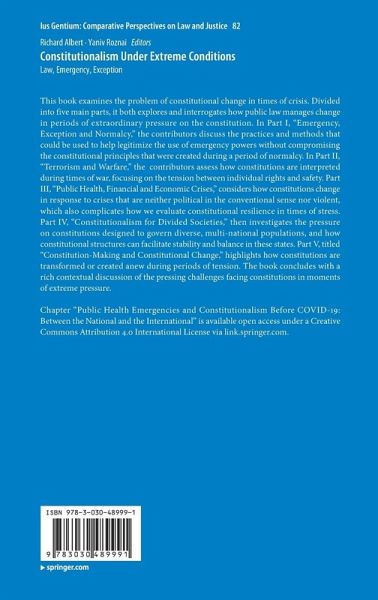 This book examines the problem of constitutional change in times of crisis. Divided into five main parts, it both explores and interrogates how public law manages change in periods of extraordinary pressure on the constitution. In Part I, "Emergency, Exception and Normalcy," the contributors discuss the practices and methods that could be used to help legitimize the use of emergency powers without compromising the constitutional principles that were created during a period of normalcy. In Part II, "Terrorism and Warfare," the contributors assess how constitutions are interpreted during times of war, focusing on the tension between individual rights and safety. Part III, "Public Health, Financial and Economic Crises," considers how constitutions change in response to crises that are neither political in the conventional sense nor violent, which also complicates how we evaluate constitutional resilience in times of stress. Part IV, "Constitutionalism for Divided Societies,"then investigates the pressure on constitutions designed to govern diverse, multi-national populations, and how constitutional structures can facilitate stability and balance in these states. Part V, titled "Constitution-Making and Constitutional Change," highlights how constitutions are transformed or created anew during periods of tension. The book concludes with a rich contextual discussion of the pressing challenges facing constitutions in moments of extreme pressure.