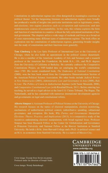 Constitutions in authoritarian regimes are often denigrated as meaningless exercises in political theater. Yet the burgeoning literature on authoritarian regimes more broadly has produced a wealth of insights into particular institutions such as legislatures, courts and elections; into regime practices such as co-optation and repression; and into non-democratic sources of accountability. In this vein, this volume explores the form and function of constitutions in countries without the fully articulated institutions of limited government. The chapters utilize a wide range of methods and focus on a broad set of cases, representing many different types of authoritarian regimes. The book offers an exploration into the constitutions of authoritarian regimes, generating broader insights into the study of constitutions and their functions more generally.