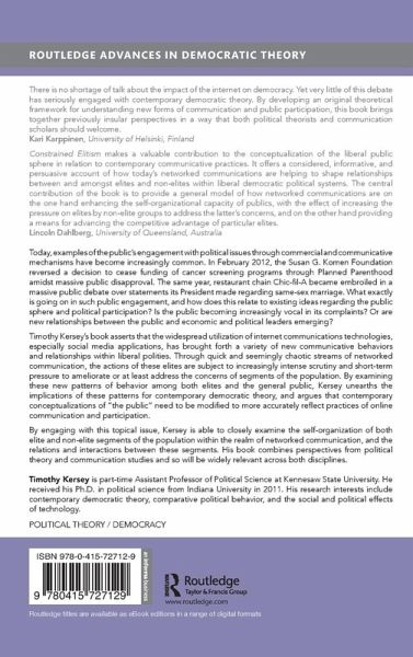 Today, examples of the public's engagement with political issues through commercial and communicative mechanisms have become increasingly common. In February 2012, the Susan G. Komen Foundation reversed a decision to cease funding of cancer screening programs through Planned Parenthood amidst massive public disapproval. The same year, restaurant chain Chic-fil-A became embroiled in a massive public debate over statements its President made regarding same-sex marriage. What exactly is going on in such public engagement, and how does this relate to existing ideas regarding the public sphere and political participation? Is the public becoming increasingly vocal in its complaints? Or are new relationships between the public and economic and political leaders emerging? Timothy Kersey's book asserts that the widespread utilization of internet communications technologies, especially social media applications, has brought forth a variety of new communicative behaviors and relationships within liberal polities. Through quick and seemingly chaotic streams of networked communication, the actions of these elites are subject to increasingly intense scrutiny and short-term pressure to ameliorate or at least address the concerns of segments of the population. By examining these new patterns of behavior among both elites and the general public, Kersey unearths the implications of these patterns for contemporary democratic theory, and argues that contemporary conceptualizations of "the public'" need to be modified to more accurately reflect practices of online communication and participation. By engaging with this topical issue, Kersey is able to closely examine the self-organization of both elite and non-elite segments of the population within the realm of networked communication, and the relations and interactions between these segments. His book combines perspectives from political theory and communication studies and so will be widely relevant across both disciplines.