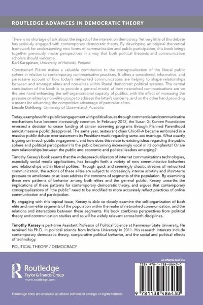 Timothy Kersey's book asserts that the widespread utilization of internet communications technologies, especially social media applications, has brought forth a variety of new communicative behaviors and relationships within liberal polities. Through quick and seemingly chaotic streams of networked communication, the actions of these elites are subject to increasingly intense scrutiny and short-term pressure to ameliorate or at least address the concerns of segments of the population. By examining these new patterns of behavior among both elites and the general public, Kersey unearths the implications of these patterns for contemporary democratic theory, and argues that contemporary conceptualizations of "the public'" need to be modified to more accurately reflect practices of online communication and participation.