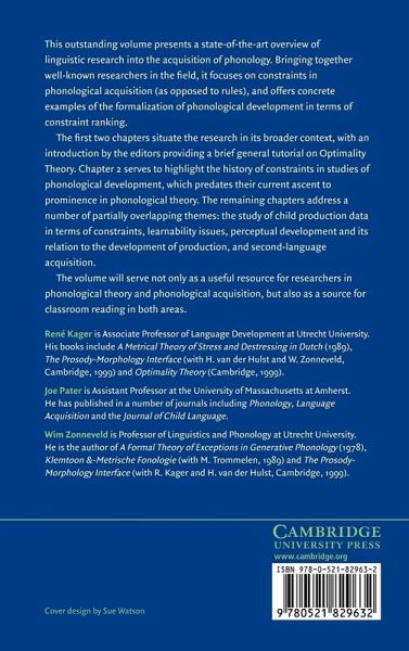 René Kager is Associate Professor of Language Development at Utrecht University. His books include A Metrical Theory of Stress and Destressing in Dutch (1989), The Prosody-Morphology Interface (with H. van der Hulst and W. Zonneveld, Cambridge 1999) and Optimality Theory (Cambridge, 1999). Joe Pater is Assistant Professor at the University of Massachusetts at Amherst. He has published in a number of journals including Phonology, Language Acquisition and the Journal of Child Language. Wim Zonneveld is Professor of Linguistics and Phonology at Utrecht University. He is the author of A Formal Theory of Exceptions in Generative Phonology (1978), Klemtoon & Metrische Fonologie (with M. Trommelen, Couthinho, 1989) and Prosody-Morphology Interface (with R. Kager and H. van der Hulst, Cambridge 1999).