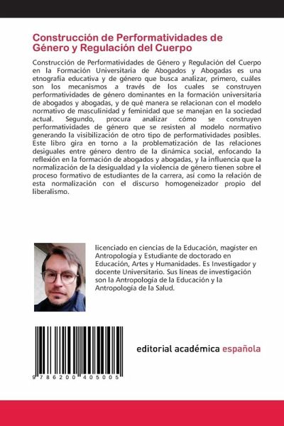 Construcción de Performatividades de Género y Regulación del Cuerpo en la Formación Universitaria de Abogados y Abogadas es una etnografía educativa y de género que busca analizar, primero, cuáles son los mecanismos a través de los cuales se construyen performatividades de género dominantes en la formación universitaria de abogados y abogadas, y de qué manera se relacionan con el modelo normativo de masculinidad y feminidad que se manejan en la sociedad actual. Segundo, procura analizar cómo se construyen performatividades de género que se resisten al modelo normativo generando la visibilización de otro tipo de performatividades posibles. Este libro gira en torno a la problematización de las relaciones desiguales entre género dentro de la dinámica social, enfocando la reflexión en la formación de abogados y abogadas, y la influencia que la normalización de la desigualdad y la violencia de género tienen sobre el proceso formativo de estudiantes de la carrera, así como la relación de esta normalización con el discurso homogeneizador propio del liberalismo.