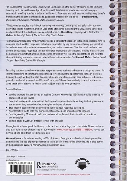 Teaching students to write constructed responses does not have to become a test-prep chore. An intentional routine of constructed responses provides powerful opportunities to teach strategic thinking through writing that also deepens students' knowledge about core subjects. In this clear guide from education consultant Warren Combs, you'll learn how and why to teach students to write these short essays, no matter what subject or grade level you teach. Special features: Writing prompts that are based on Webb's Depth of Knowledge (DOK) and provide practice for students at all skill levels Practical strategies to build critical thinking and improve students' writing, including sentence stems, acrostics, framed stories, analogies, and quad clusters Student self-assessment guidelines and rigorous peer-response strategies An interactive log to help you manage best practices and keep students engaged Reading-Writing Modules to help you review and implement the instructional practices and strategies Sample student work, at different levels, with analysis Throughout the book, you'll find handy tools such as rubrics, logs, and checklists. These tools are also available as free eResources on our website, www.routledge.com/9781138931046, so you can download and print them for immediate use.