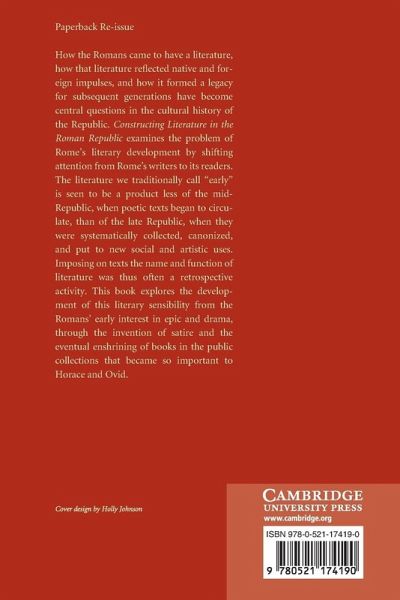 This book examines how the Romans came to have a literature, how that literature reflected native and foreign impulses, and how it formed a legacy for subsequent generations have become central questions in the cultural history of the Republic. It examines the problem of Rome's literary development by shifting attention from Rome's writers to its readers. The literature we traditionally call 'early' is seen to be a product less of the mid-Republic, when poetic texts began to circulate, than of the late Republic, when they were systematically collected, canonized, and put to new social and artistic uses. Imposing on texts the name and function of literature was often a retrospective activity. This book explores the development of this literary sensibility from the Romans' early interest in epic and drama, through the invention of satire and the eventual enshrining of books in the public collections important to Horace and Ovid.