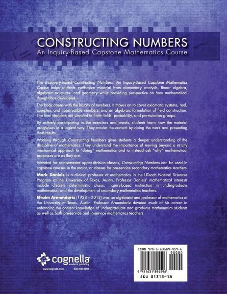 The discovery-based Constructing Numbers: An Inquiry-Based Capstone Mathematics Course helps students synthesize material from elementary analysis, linear algebra, algebraic structures, and geometry while providing perspective on how mathematical thought has developed. The book opens with the history of numbers. It moves on to cover axiomatic systems, real, complex, and constructible numbers, and an algebraic formulation of field construction. The final chapters are devoted to finite fields, probability, and permutation groups. By actively participating in the exercises and proofs, students learn how the material progresses in a logical way. They master the content by doing the work and presenting their results. Working through Constructing Numbers gives students a deeper understanding of the discipline of mathematics. They understand the importance of moving beyond a strictly mechanical approach to “doing” mathematics and to instead ask “why” mathematical processes are as they are. Intended for one-semester upper-division classes, Constructing Numbers can be used in capstone courses in the major, or classes for pre-service secondary mathematics teachers.