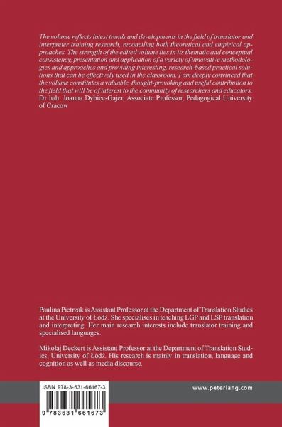 «The volume reflects latest trends and developments in the field of translator and interpreter training research, reconciling both theoretical and empirical approaches. The strength of the edited volume lies in its thematic and conceptual consistency, presentation and application of a variety of innovative methodologies and approaches and providing interesting, research-based practical solutions that can be effectively used in the classroom. I am deeply convinced that the volume constitutes a valuable, thought-provoking and useful contribution to the field that will be of interest to the community of researchers and educators.» Dr hab. Joanna Dybiec-Gajer, Associate Professor, Pedagogical University of Cracow
