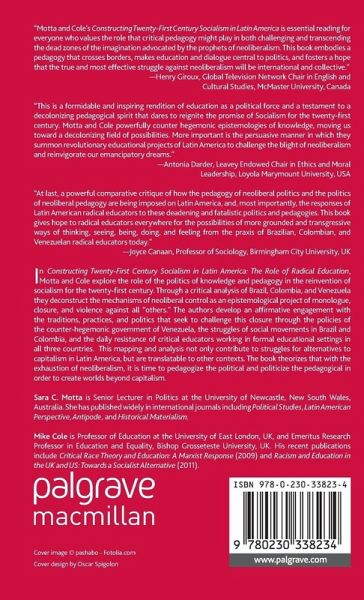"Motta and Cole's Constructing Twenty-First Century Socialism in Latin America is essential reading for everyone who values the role that critical pedagogy might play in both challenging and transcending the dead zones of the imagination advocated by the prophets of neoliberalism. This book embodies a pedagogy that crosses borders, makes education and dialogue central to politics, and fosters a hope that the true and most effective struggle against neoliberalism will be international and collective." - Henry Giroux, Global Television Network Chair in English and Cultural Studies, McMaster University, Canada