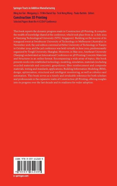 This book presents the dynamic advancements achieved in Construction 3D Printing, showcasing a wealth of insights from the conference held from 19-21 July 2023 at Nanyang Technological University (NTU), Singapore. Covering a broad spectrum of topics, this volume presents research on established technologies, modeling, simulation, diverse materials (including recycled and geopolymer materials), fiber reinforcement, and composite materials, as well as testing protocols and standards. It also delves into applications, Building Information Modeling (BIM), design methodologies, optimization strategies, structural considerations, intelligent monitoring, and the role of robotics and automation. Serving as a timely and invaluable resource, this book offers both scholars and professionals in the expansive field of Construction 3D Printing profound insights into its decade-long progress and its preparedness for wider adoption.