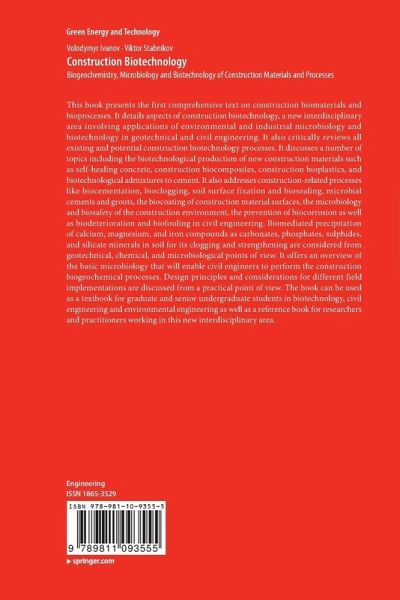 It discusses a number of topics including the biotechnological production of new construction materials such as self-healing concrete, construction biocomposites, construction bioplastics, and biotechnological admixtures to cement. It also addresses construction-related processes like biocementation, bioclogging, soil surface fixation and biosealing, microbial cements and grouts, the biocoating of construction material surfaces, the microbiology and biosafety of the construction environment, the prevention of biocorrosion as well as biodeterioration and biofouling in civil engineering. Biomediated precipitation of calcium, magnesium, and iron compounds as carbonates, phosphates, sulphides, and silicate minerals in soil for its clogging and strengthening are considered from geotechnical, chemical, and microbiological points of view. It offers an overview of the basic microbiology that will enable civil engineers to perform the construction biogeochemical processes. Design principles and considerations for different field implementations are discussed from a practical point of view. The book can be used as a textbook for graduate and senior undergraduate students in biotechnology, civil engineering and environmental engineering as well as a reference book for researchers and practitioners working in this new interdisciplinary area.