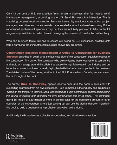 Only 43 per cent of U.S. construction firms remain in business after four years. Why? Inadequate management, according to the U.S. Small Business Administration. This is surprising because most construction firms are formed by ambitious construction project managers, executives and tradesmen who have excelled at what they have been doing. But as experienced as these entrepreneurs may be, they are not likely prepared to take on the full range of responsibilities forced on them in managing the business of construction in its entirety.While this business failure rate and its causes are based on U.S. experience, available data from a number of other industrialized countries shows they are similar.This book describes in detail what the business side of the construction equation requires of the construction firm owner. The contractor who quickly learns these requirements can identify and avoid or manage around the pitfalls that cause the high failure rate in our industry and put his or her construction firm on a level playing field with the best-run companies in the business. The detailed duties of the owner, whether in the U.S., U.K., Australia or Canada, are a common theme throughout the book. The author, Nick Ganaway, speaks peer-to-peer, and the book is sprinkled with supporting examples from his own experience. He is immersed in the industry and this book is "based on the things I've learned, used, and refined as a light-commercial general contractor in the course of starting and operating my own construction firm for 25 years." The contractor doing $5 million or $50 million or more in annual sales or the equivalent amount in other countries, or the entrepreneur who is just starting up, can use the tried and proven material in this book to build a business that is profitable, enjoyable, and enduring.Additionally, the book devotes a chapter to specializing in chain-store construction.