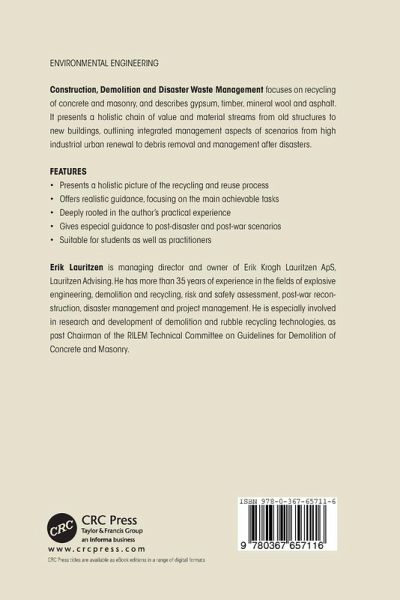 Construction and Demolition Waste (CDW), from the construction, maintenance, renovation and demolition of buildings and structures, represents a large proportion of the waste in industrialized societies. Compared to other forms, such as household waste, more than 90% of CDW can be used as a resource and a substitute for construction materials, especially for primary, natural raw materials. Reuse, recovery and recycling depends on the quality and market for the materials, and the environmental impact of the processes for conversion of CDW from old structures to its use in new structures. However, the utilization today of CDW products as secondary resources is marginal. Most CDW is deposited or used as fill material, and the opportunities of high quality recycling are generally neglected. This book presents the opportunities for the sustainable and resource efficient utilisation of CDW, focusing on recycling of concrete and masonry as the major forms of CDW. The recycling of gypsum, timber, mineral wool, asphalt and other types are also described. Its aim is to present a chain of value and material streams in the transformation of obsolete buildings and structures into new buildings and structures. It takes a holistic view, focusing on the lifecycle economy (the circular economy) and integrated management aspects of various scenarios ranging from high industrial urban renewal to debris removal and management after disasters and conflicts. It is based on the author¿s 35 years of research and development combined with practical international experience within the demolition and recycling area. It addresses students, architects, civil engineers, building owners, public authorities and others working in urban planning, demolition and resource management in the building and construction sector and in the reconstruction of damaged buildings after disasters and wars.