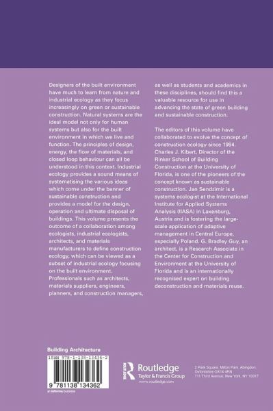 Contents: Foreword. Preface. Introduction. 1. Defining an Ecology of Construction. Part 1. The Ecologists. 2. Material Circulation, Energy Hierarchy, and Building Construction. 3. On Complexity Theory, Exergy, and Industrial Ecology, 4. Applying the Principles of Ecological Emergence to Building Design and Construction. 5. Using Ecological Dynamics to Move Towards an Adaptive Architecture. Part 2. The Industrial Ecologists. 6. Minimizing Waste Emissions from the Built Environment. 7. Industrial Ecology and the Built Environment. 8. Construction Ecology and Metabolism. 9. Construction Ecology. Part 3. The Architects. 10. Ecologic Analogues and Architecture. 11. Natural Metabolism as the Basis for "Intelligent" Architecture. 12. Green Architecture. Conclusions. Glossary Index.