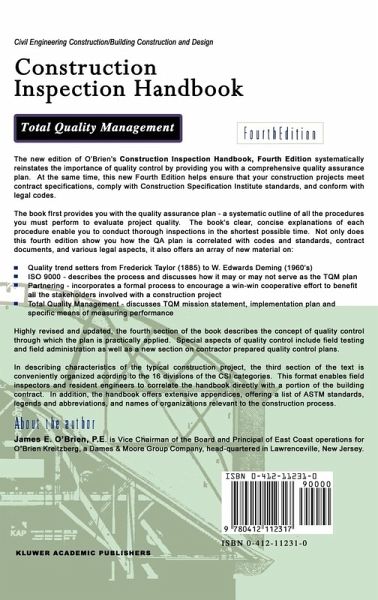Since the publication of the third edition in 1989, changes in quality control/assurance have affected the construction industry. This new fourth edition includes revised and new material relating to Section A, specifically Total Quality Management, ISO 9000, and quality control. The Codes and Standards Section, Contract Documents, and Legal Documents Sections have also been extensively updated. Construction Inspection Handbook systematically reinstates the importance of quality by providing you with a comprehensive quality assurance plan. At the same time, this ensures that your construction projects meet contract specifications, comply with Construction Specification Institute standards, and conform with safety requirements and legal codes.