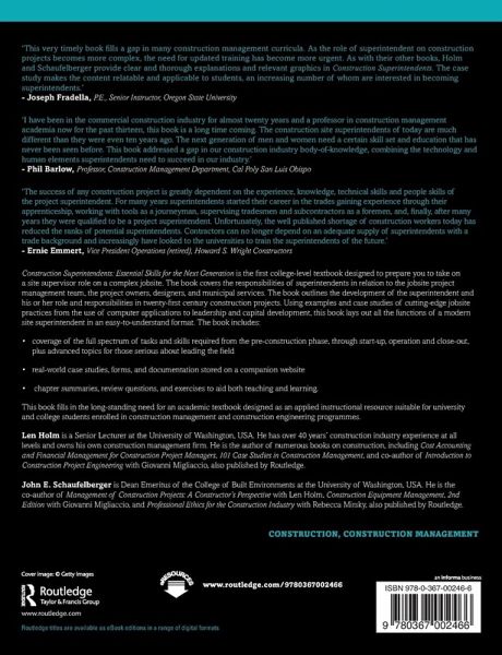 Len Holm is a Senior Lecturer at the University of Washington, USA. He has over 40 years' construction industry experience at all levels and owns his own construction management firm. He is the author of numerous books on construction, including Cost Accounting and Financial Management for Construction Project Managers, 101 Case Studies in Construction Management , and co-author of Introduction to Construction Project Engineering with Giovanni Migliaccio, also published by Routledge. John E. Schaufelberger is Dean Emeritus of the College of Built Environments at the University of Washington, USA. He is the co-author of Management of Construction Projects: A Constructor's Perspective with Len Holm, Construction Equipment Management, 2nd Edition with Giovanni Migliaccio, and Professional Ethics for the Construction Industry with Rebecca Mirsky, also published by Routledge.