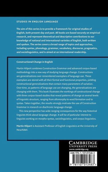 Martin Hilpert combines construction grammar and advanced corpus-based methodology into a new way of studying language change. Constructions are generalizations over remembered exemplars of language use. These exemplars are stored with all their formal and functional properties, yielding constructional generalizations that contain many parameters of variation. Over time, as patterns of language use are changing, the generalizations are changing with them. This book illustrates the workings of constructional change with three corpus-based studies that reveal patterns of change at several levels of linguistic structure, ranging from allomorphy to word formation and to syntax. Taken together, the results strongly motivate the use of construction grammar in research on diachronic language change. This new perspective has wide-ranging consequences for the way historical linguists think about language change. It will be of particular interest to linguists working on morpho-syntax, sociolinguistics and corpus linguistics.