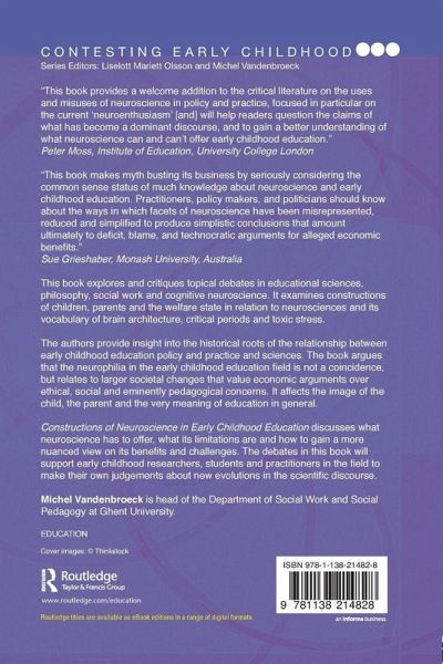 'This book provides a welcome addition to the critical literature on the uses and misuses of neuroscience in policy and practice, focused in particular on the current 'neuroethusiasm' that pervades much advocacy for early intervention and contributes to early childhood services increasingly becoming a technical practice for governing child and parent alike. In keeping with the aims of the series Contesting Early Childhood, the book will help readers question the claims of what has become a dominant discourse, and to gain a better understanding of what neuroscience can and can't offer early childhood education.' - Emeritus Professor Peter Moss, Institute of Education, University College London