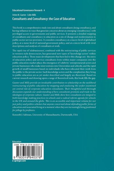 This book is a comprehensive study into and about consultants doing consultancy, and having influence in ways that generate concerns about an emerging 'consultocracy', with privileged access to governments and public services. It presents a detailed mapping of consultants and consultancy in education as a site of change and modernisation in public sector service provision. It considers consultancy at a macro-level of globalised policy, at a meso-level of national government policy, and at a micro level with vivid descriptions and analyses of consultants at work.