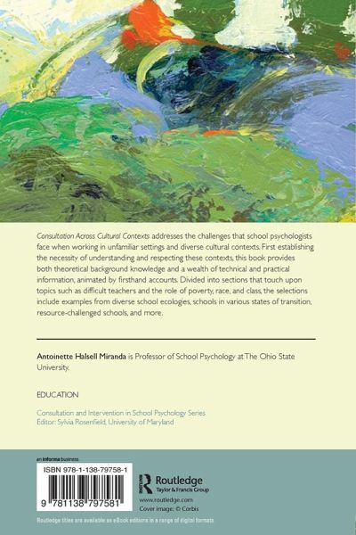 Foreword. Colette Ingraham. Acknowledgements. Introduction: Consultation with Diversity in Mind. Antoinette Halsell Miranda. Part I. The Cultural Context of Schools. Chapter 1: Consulting with a Social Justice Mindset.Antoinette Halsell Miranda and Kisha M. Radliff. Chapter 2: Engaging in Culturally Responsive Consultation Practices. Emilia C. Lopez and Jennifer Kong. Part II. Consultation with Teachers Who Present Barriers. Chapter 3: What to do when a Consultee Views Students as "The Problem". Erin M. McClure. Chapter 4: Working Against the School to Prison Pipeline: Lessons from a Novice Consultant. Amy Bremer. Chapter 5: Conceptualizing Problems by Focusing Cultural Context, Bias, and Generalization. Maggie Beard. Part III. Consultation within the Cultural Context of Poverty, Race, and School. Chapter 6: The Problem Associated with Viewing Students through a Deficit Lens. Naima Shirdon. Chapter 7: Improving Self-Esteem and Reducing Female Relational Aggression in Urban Classrooms. Lauren Wargelin and McKenzie Mallen. Chapter 8: Identifying, Understanding, and Navigating the Unalterables in a Consultation Case to Affect Change. Nicole M. Brown. Part IV. Culturally Competent Consultation Practice Leads to Success. Chapter 9: The Culturally Confident Consultee: Successful Multicultural School Consultation. Carly Tindall. Chapter 10: Cultural Understanding and Communication: Keys to Successful Multicultural School Consultation. Abigail Baillie. Chapter 11: A Tale of Two Teachers: How Collaboration Sparks Success in Consultation. Kristen N. Heering. Chapter12: Summary/Conclusion. Antoinette Halsell Miranda. List of Contributors.
