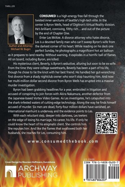 CONSUMED is a high-energy free-fall through the twisted inner sanctums of Seattle’s high-tech elite. In the center is Byron Wells, head of Digitron’s Virtual Reality division. He’s brilliant, conniving, fifthly rich… and out of the picture by the end of Chapter One. Enter Less McKee. A divorce attorney who hates divorce, Les is a devoted family man who can’t sweep Byron’s wife from the darkest corner of his heart. While reading on his deck one perfect Sunday, he photographs a magnificent hot air balloon as it prepares to land nearby. Without warning, it explodes in a horrific ball of flames. All on board, including Byron, are killed. His mysterious client, Beverly, is Byron’s seductive, alluring but soon to be ex-wife. From the time they were college sweethearts, Beverly has been a part of his life, though he chose to tie the knot with her best friend. He handled her gut-wrenching first divorce from a shady nightclub owner who won’t stop haunting him. And now her multi-million dollar second divorce from Byron Wells has erupted into a massive murder investigation. Byron had been grabbing headlines for a year, embroiled in litigation and accused of conspiring to join forces with Akira Nakamura, another defector from the Japanese-based Vortex Video Games. As Les investigates, he catapulted into the shark-infested waters of cutting-edge technology. Along the way he finds himself accused of murder. Six men are dead, forty-four million dollars have vanished, and international manhunt is underway and the evidence point to Les. With each reluctant step, deeper into darkness, Les teeters on the edge of losing his marriage, his career, his life. If only he could know the heart of his enigmatic client. She controls him. She repulses him. And like the flames that swallowed both her husbands, she reaches for Les, consuming him.