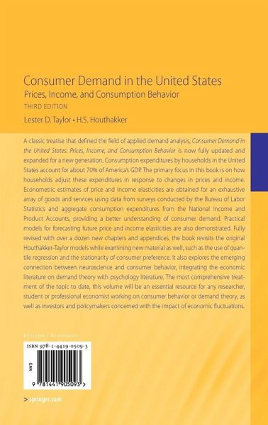 A classic treatise that defined the field of applied demand analysis, Consumer Demand in the United States: Prices, Income, and Consumption Behavior is now fully updated and expanded for a new generation. Consumption expenditures by households in the United States account for about 70% of America's GDP. The primary focus in this book is on how households adjust these expenditures in response to changes in price and income. Econometric estimates of price and income elasticities are obtained for an exhaustive array of goods and services using data from surveys conducted by the Bureau of Labor Statistics and aggregate consumption expenditures from the National Income and Product Accounts, providing a better understanding of consumer demand. Practical models for forecasting future price and income elasticities are also demonstrated. Fully revised with over a dozen new chapters and appendices, the book revisits the original Houthakker-Taylor models while examining new material as well, such as the use of quantile regression and the stationarity of consumer preference. It also explores the emerging connection between neuroscience and consumer behavior, integrating the economic literature on demand theory with psychology literature. The most comprehensive treatment of the topic to date, this volume will be an essential resource for any researcher, student or professional economist working on consumer behavior or demand theory, as well as investors and policymakers concerned with the impact of economic fluctuations.