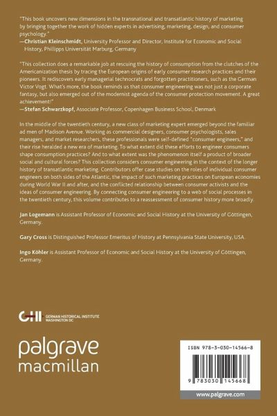 1. Beyond the Mad Men: Consumer Engineering and the Rise of Marketing Management, 1920s-1970s: An Introduction.- I. Twentieth-Century Marketing: Aspirations and Limits, Costs, and Benefits.- 2. Marketing as "Consumer Engineering"? A Concept in Transatlantic Perspective, 1930s-1960s.- 3. What Does "Fast Capitalism" Mean for Consumers? Examples of Consumer Engineering in the United States.- 4. A Theoretical Exploration of Consumer Engineering: Implicit Contracts and Market Making.- II. Consumer Engineers and Transatlantic Exchanges at Mid-Century.- 5. Shopping Malls and Social Democracy: Victor Gruen's Postwar Campaign for Conscientious Consumption in American Suburbia.- 6. Consumer-Based Research: Walter Landor and the Value of Packaging Design in Marketing.- 7. German-Style Consumer Engineering: Victor Vogt's Verkaufspraxis, 1925-1950.- III. Consumer Engineering Practices in Postwar Europe.- 8. Consumer Credit as a Marketing Tool: The French Experience in European andTransatlantic Comparison, 1950s-1960s.- 9. Adidas and the Creation of a Transnational Market for German Athletic Shoes, 1948-1978.- 10. Imagined Images, Surveyed Consumers: Market Research as a Means of Consumer Engineering, 1950s-1980s.- IV. Consumer Engineering and Consumer Movements.- 11. Marketing a New Society or Engineering Kitchens? IKEA and the Swedish Consumer Agency.- 12. "The Consumer Crusader": Hugo Schui and the German Consumers Association.- 13. Consumer Engineering by Belgian Consumer Movements: From Modern Marketing with a Transnational Touch to Late-Modern Insecurities, 1957-2000.