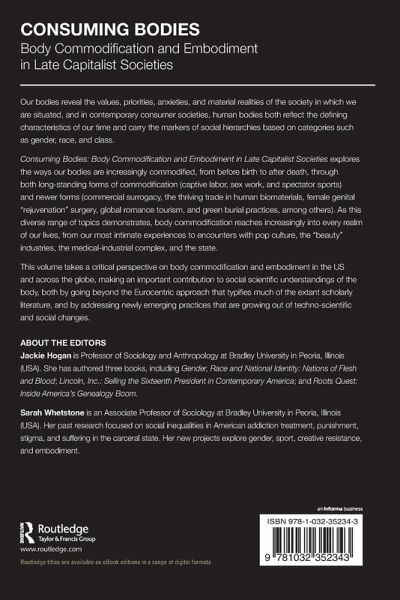 Consuming Bodies: Body Commodification and Embodiment in Late Capitalist Societies explores the ways our bodies are increasingly commodified, from before birth to after death, through both long-standing forms of commodification (captive labor, sex work, and spectator sports) and newer forms (commercial surrogacy, the thriving trade in human biomaterials, female genital "rejuvenation" surgery, global romance tourism, and green burial practices, among others). As this diverse range of topics demonstrates, body commodification reaches increasingly into every realm of our lives, from our most intimate experiences to encounters with pop culture, the "beauty" industries, the medical-industrial complex, and the state.