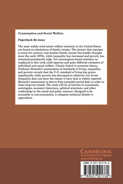 The most widely cited social welfare statistics in the United States are based on tabulations of family income. The picture that emerges gives cause for concern: median family income has hardly changed over the last twenty-five years while inequality has increased and poverty remains persistently high. Yet consumption-based statistics as employed in this work yield rigorous and quite different estimates of real individual and social welfare. Closely linked to economic theory, Professor Slesnick's examination of standards of living, inequality, and poverty reveal that the standard of US living has grown significantly while inequality and poverty have decreased to relatively low levels. His assessment is drawn from extended period data in order to chart long-run trends. The work will be of interest to economists, sociologists, economic historians, political scientists, and other readers in the social and policy sciences. Designed to be accessible to non-economists, technical details are relegated to appendices.
