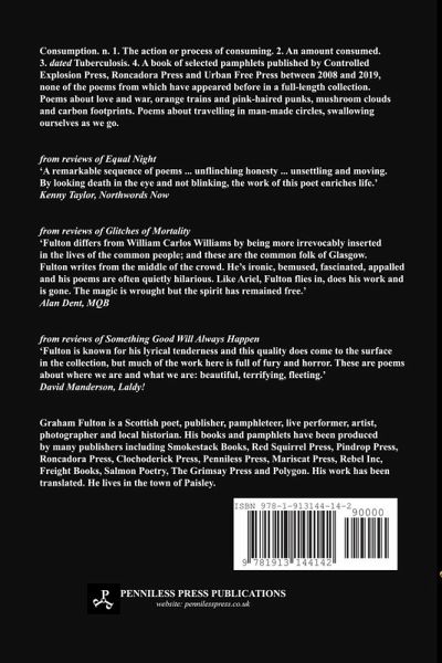 Consumption. n. 1. The action or process of consuming. 2. An amount consumed. 3. dated Tuberculosis. 4. A book of selected pamphlets published by Controlled Explosion Press, Roncadora Press and Urban Free Press between 2008 and 2019, none of the poems from which have appeared before in a full-length collection. Poems about love and war, orange trains and pink-haired punks, mushroom clouds and carbon footprints. Poems about travelling in man-made circles, swallowing ourselves as we go. Graham Fulton is a Scottish poet, publisher, pamphleteer, live performer, artist, photographer and local historian. His books and pamphlets have been produced by many publishers including Smokestack Books, Red Squirrel Press, Pindrop Press, Roncadora Press, Clochoderick Press, Penniless Press, Mariscat Press, Rebel Inc, Freight Books, Salmon Poetry, The Grimsay Press and Polygon. His work has been translated. He lives in the town of Paisley.