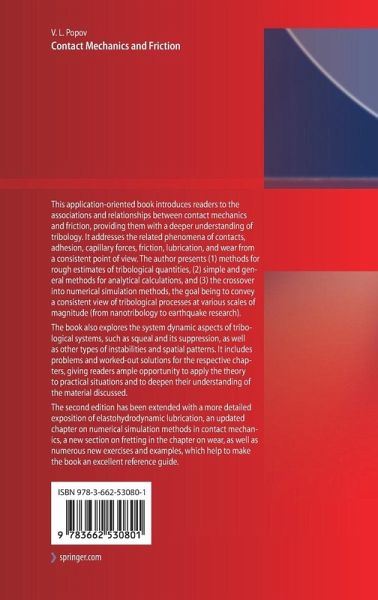 This application-oriented book introduces readers to the associations and relationships between contact mechanics and friction, providing them with a deeper understanding of tribology. It addresses the related phenomena of contacts, adhesion, capillary forces, friction, lubrication, and wear from a consistent point of view. The author presents (1) methods for rough estimates of tribological quantities, (2) simple and general methods for analytical calculations, and (3) the crossover into numerical simulation methods, the goal being to convey a consistent view of tribological processes at various scales of magnitude (from nanotribology to earthquake research). The book also explores the system dynamic aspects of tribological systems, such as squeal and its suppression, as well as other types of instabilities and spatial patterns. It includes problems and worked-out solutions for the respective chapters, giving readers ample opportunity to apply the theory to practical situations and to deepen their understanding of the material discussed.