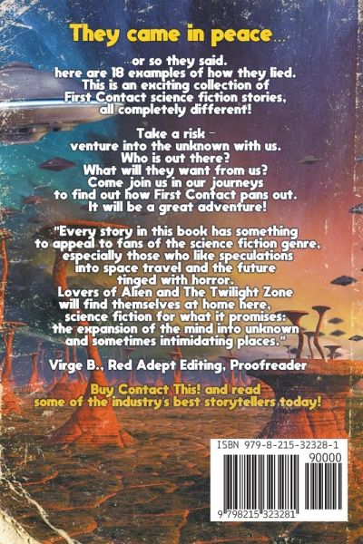 They came in peace… …or so they said. Here are 18 examples of how they lied. This is an exciting collection of First Contact science fiction stories, all completely different! Take a risk – venture into the unknown with us. Who is out there? What will they want from us? Come join us in our adventure to find out how 1st Contact pans out. It will be a great adventure! "Every story in this book has something to appeal to fans of the science fiction genre, especially those who like speculations into space travel and the future tinged with horror. Lovers of Alien and The Twilight Zone will find themselves at home here, and so will anyone who enjoys science fiction for what it promises: the expansion of the mind into unknown and sometimes intimidating places." Virge B., Red Adept Editing, Proofreader Buy Contact This! and read some of the industry's best storytellers today! Walt Robillard - Delta Rescue 1 Corey Truax - Reaper's Fall Aaron Seaman - The Last Seaman Chris Winder - Memories Nathan Pedde - From Planet Everdark J. R. Frontera - The X Café Tim Niederriter - Negotiation Negated I. Ronik - The Incident at Wallings Creek IQ Malcolm - Catch Island J. Daniel Sawyer - Pumpernickel Rick Shaw - Fiddler Luke T. Barnett - Because Why Not Lawrence N. Oliver - Colonies Fall R. Max Tillsley - Replication J.R. Murdock - Last Day of Reign Paul E Cooley - Whispers J. R. Handley - Ishtar's Rising Rick Partlow - Legends