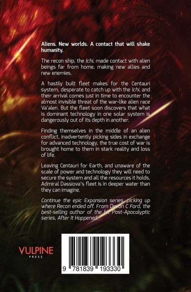 Aliens. New worlds. A contact that will shake humanity. The recon ship, the Ichi, made contact with alien beings far from home, making new allies and new enemies. A hastilybuilt fleet makes for the Centauri system, desperate to catch up with the Ichi, and their arrival comes just in time to encounter the almost invisible threat of the warlike alien raceVa'alen. But the fleet soon discovers that what is dominant technology in one solar system is dangerously out of its depth in another. Finding themselves in the middle of an alien conflict, inadvertently picking sides in exchange for advanced technology, the true cost of war is brought home to them in stark reality and loss of life. Leaving Centauri for Earth, and unaware of the scale of power and technology they will need to secure the system and all the resources it holds, Admiral Dassiova's fleet is in deeper water than they can imagine. Continue the epic Expansion series, picking up where Recon ended off. From Devon C Ford, the bestselling author of the hit PostApocalyptic series, After It Happened.