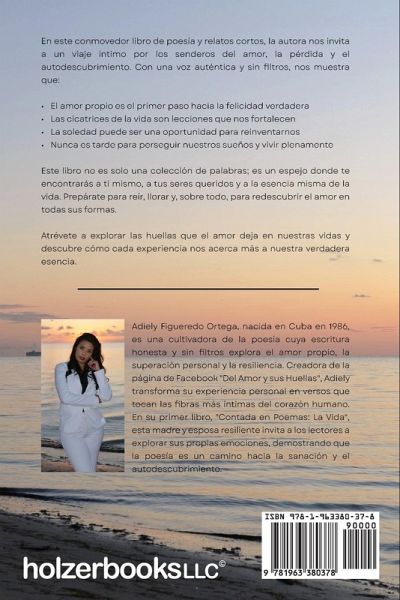 En este conmovedor libro de poesía y relatos cortos, la autora nos invita a un viaje íntimo por los senderos del amor, la pérdida y el autodescubrimiento. Con una voz auténtica y sin filtros, nos muestra que:¿El amor propio es el primer paso hacia la felicidad verdadera Las cicatrices de la vida son lecciones que nos fortalecen La soledad puede ser una oportunidad para reinventarnos Nunca es tarde para perseguir nuestros sueños y vivir plenamente Este libro no es solo una colección de palabras; es un espejo donde te encontrarás a ti mismo, a tus seres queridos y a la esencia misma de la vida. Prepárate para reír, llorar y, sobre todo, para redescubrir el amor en todas sus formas. Atrévete a explorar las huellas que el amor deja en nuestras vidas y descubre cómo cada experiencia nos acerca más a nuestra verdadera esencia. Adiely Figueredo Ortega, nacida en Cuba en 1986, es una cultivadora de la poesía cuya escritura honesta y sin filtros explora el amor propio, la superación personal y la resiliencia. Creadora de la página de Facebook "Del Amor y sus Huellas", Adiely transforma su experiencia personal en versos que tocan las fibras más íntimas del corazón humano. En su primer libro, "Contada en Poemas: La Vida", esta madre y esposa resiliente invita a los lectores a explorar sus propias emociones, demostrando que la poesía es un camino hacia la sanación y el autodescubrimiento.