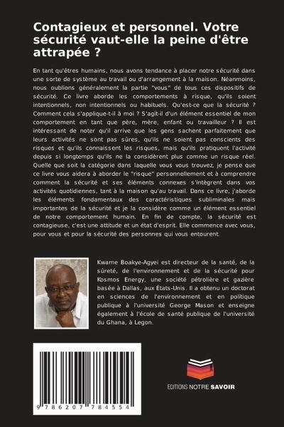 En tant qu'êtres humains, nous avons tendance à placer notre sécurité dans une sorte de système au travail ou d'arrangement à la maison. Néanmoins, nous oublions généralement la partie "vous" de tous ces dispositifs de sécurité. Ce livre aborde les comportements à risque, qu'ils soient intentionnels, non intentionnels ou habituels. Qu'est-ce que la sécurité ? Comment cela s'applique-t-il à moi ? S'agit-il d'un élément essentiel de mon comportement en tant que père, mère, enfant ou travailleur ? Il est intéressant de noter qu'il arrive que les gens sachent parfaitement que leurs activités ne sont pas sûres, qu'ils ne soient pas conscients des risques et qu'ils connaissent les risques, mais qu'ils pratiquent l'activité depuis si longtemps qu'ils ne la considèrent plus comme un risque réel. Quelle que soit la catégorie dans laquelle vous vous trouvez, je pense que ce livre vous aidera à aborder le "risque" personnellement et à comprendre comment la sécurité et ses éléments connexes s'intègrent dans vos activités quotidiennes, tant à la maison qu'au travail. Dans ce livre, j'aborde les éléments fondamentaux des caractéristiques subliminales mais importantes de la sécurité et je la considère comme un élément essentiel de notre comportement humain. En fin de compte, la sécurité est contagieuse, c'est une attitude et un état d'esprit. Elle commence avec vous, pour vous et pour la sécurité des personnes qui vous entourent.