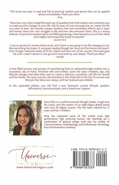 "This book was easy to read and full of practical wisdom and advice that can be applied almost immediately. Thank you Mina." - Kirsy "Mina has a very kind, straightforward way of speaking that both inspires and motivates you to make positive changes in your life. She focuses on wise introspection to create the life you want to have. She teaches unique mindsets that have immediate effects and is open and honest about her own struggles in life and how she overcame them. She is a strong believer of powerful transformation and lifelong learning. I have learned so much from Mina and I highly recommend her book to anyone!" - Jasmin Frick "I was so excited to receive Mina's book, and I knew it was going to be life changing to me, like everything she shares. It was great reading through her story and the lessons she learnt. Even though I watched nearly all of her videos and have two of her courses, this book gave me a lot. I read it almost in one go and it nurtured my soul deeply. Thank you Mina." - Kamilla A love filled process and journey of transitioning from an exhausted single mother into a nourished, stay at home, feminine wife and mother. Learn the exact mindsets, tips, and lifestyle changes that Mina Irfan took to create a delicious, nourished, soft life for herself and her family. The exact journey documented in this book led to the top 1% success and lifestyle that Mina now enjoys with her husband and children. In this expanded edition, you will find a new foreword, current lifestyle updates, affirmations, journal prompts, and a brand new chapter! Mina Irfan is a world-renowned thought leader, tough love life coach, and the creator of an eight-figure global brand with over 60 digital courses. She has been married for 15 years and has 3 children. She has mentored some of the world's most high performance, high achieving women. Her teachings are a combination of spiritual energy work plus her studies of Communications, Anthropology, and Evolutionary Psychology from Northwestern University. www.theuniverseguru.com