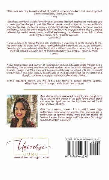 "This book was easy to read and full of practical wisdom and advice that can be applied almost immediately. Thank you Mina." - Kirsy "Mina has a very kind, straightforward way of speaking that both inspires and motivates you to make positive changes in your life. She focuses on wise introspection to create the life you want to have. She teaches unique mindsets that have immediate effects and is open and honest about her own struggles in life and how she overcame them. She is a strong believer of powerful transformation and lifelong learning. I have learned so much from Mina and I highly recommend her book to anyone!" - Jasmin Frick "I was so excited to receive Mina's book, and I knew it was going to be life changing to me, like everything she shares. It was great reading through her story and the lessons she learnt. Even though I watched nearly all of her videos and have two of her courses, this book gave me a lot. I read it almost in one go and it nurtured my soul deeply. Thank you Mina." - Kamilla A love filled process and journey of transitioning from an exhausted single mother into a nourished, stay at home, feminine wife and mother. Learn the exact mindsets, tips, and lifestyle changes that Mina Irfan took to create a delicious, nourished, soft life for herself and her family. The exact journey documented in this book led to the top 1% success and lifestyle that Mina now enjoys with her husband and children. In this expanded edition, you will find a new foreword, current lifestyle updates, affirmations, journal prompts, and a brand new chapter! Mina Irfan is a world-renowned thought leader, tough love life coach, and the creator of an eight-figure global brand with over 60 digital courses. She has been married for 15 years and has 3 children. She has mentored some of the world's most high performance, high achieving women. Her teachings are a combination of spiritual energy work plus her studies of Communications, Anthropology, and Evolutionary Psychology from Northwestern University. www.theuniverseguru.com