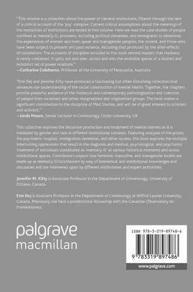 This collection explores the discursive production and treatment of mental distress as it is mediated by gender and race in different institutional contexts. Featuring analyses of the prison, the psychiatric hospital, immigration detention, and other locales, this book explores the multiple interlocking oppressions that result in the diagnosis and medical, psychological, and psychiatric treatment of individuals constituted as 'mentally ill' at various historical moments and across institutional spaces. Contributors unpack how feminine, masculine, and transgender bodies are made up as mentally ill/sick/deviant by way of biomedical and institutional knowledges and discourses and are intervened upon by different institutional and expert authorities.