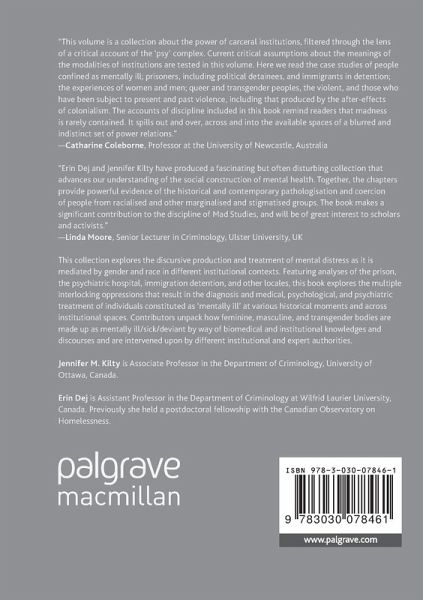 This collection explores the discursive production and treatment of mental distress as it is mediated by gender and race in different institutional contexts. Featuring analyses of the prison, the psychiatric hospital, immigration detention, and other locales, this book explores the multiple interlocking oppressions that result in the diagnosis and medical, psychological, and psychiatric treatment of individuals constituted as 'mentally ill' at various historical moments and across institutional spaces. Contributors unpack how feminine, masculine, and transgender bodies are made up as mentally ill/sick/deviant by way of biomedical and institutional knowledges and discourses and are intervened upon by different institutional and expert authorities.