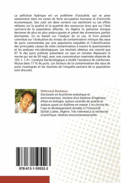 La pollution hydrique est un problème d'actualité, qui se pose notamment dans les zones de forte occupation humaine et d'activités économiques. Son coût est dans certains cas exorbitant vu ses effets néfastes sur la qualité et la quantité des ressources ainsi que sur l'état sanitaire de la population affectés. En Algérie la pollution nitrique devienne de plus en plus préoccupante et prend des dimensions parfois alarmantes. En se basant sur l'analyse de ce cas, le livre présent contribue sur l'évaluation du niveau de contamination nitrique des eaux de puits consommées par une population enquêtée et l'identification des principales causes de cette contamination à travers le questionnaire et les analyses microbiologiques. Les résultats obtenus ont montré que 67 % des puits prélevés présentent un taux en nitrates dépassant la norme qui est de 50 mg/L avec une concentration maximale observée de 103 ± 1.41. L'analyse bactériologique a révélé l'existence de coliformes fécaux dans 17 % de puits. Les facteurs de la contamination des eaux de puits investigués et les résultats de l'enquête sanitaire de la population sont discutés.