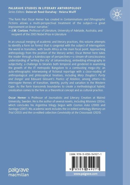 In an unusual merging of academic and literary practices, this volume attempts to identify a form (or forms) that is congenial with the subject of interrogation: the world in transition, with South Africa as the main focal point. Approaching anthropology from the position of the literary writer, Oscar Hemer here takes the reader through a kaleidoscope of perspectives-a stream-of-consciousness understanding of "writing the city" of Johannesburg, embedding ethnography in subjectivity; a challenge to binaries both temporal and gendered in examining the growth of the IT metropolis Bangalore to a combusting mega-city; an auto-ethnographic interweaving of fictional reportage with a close-reading of anthropological and philosophical treatises, including Mary Douglas's Purity and Danger and Edouard Glissant's Poetics of Relation, among others-to interrogate themes of transition, identity, purity and variation in the Western Cape. As the form transcends boundaries to create a methodological hybrid, creolization comes to the fore as a theoretical concept and as cultural practice.